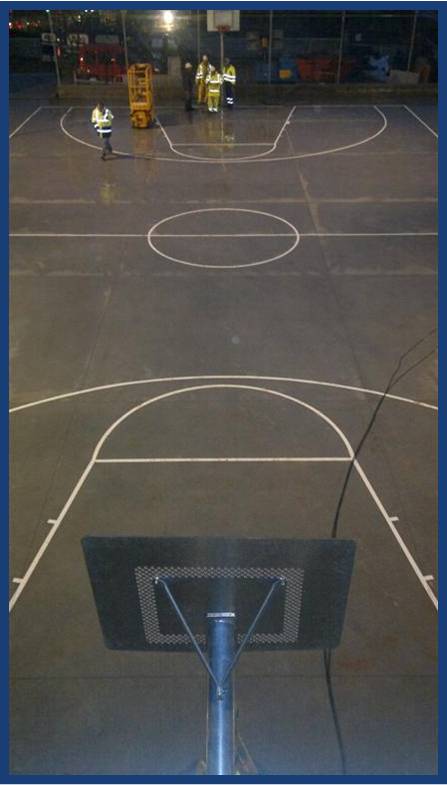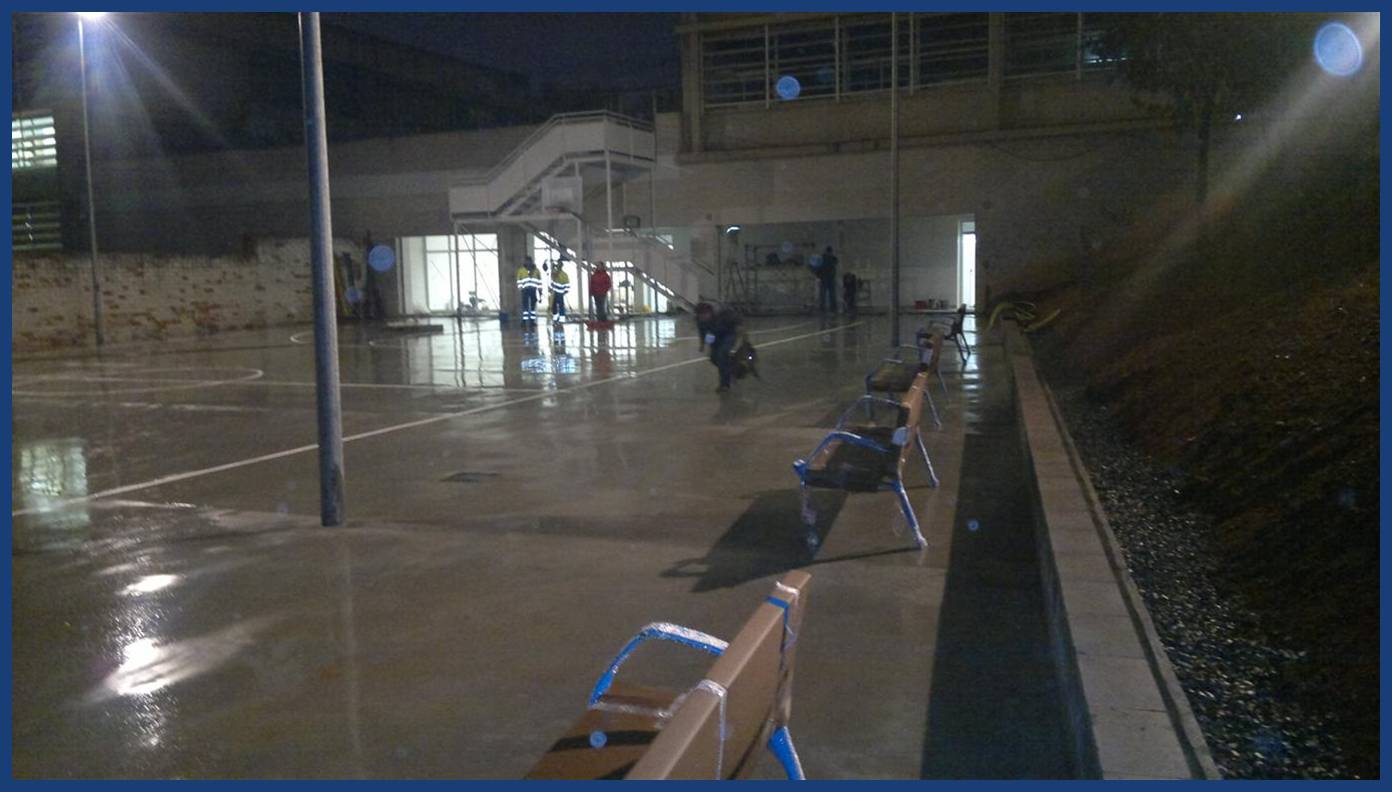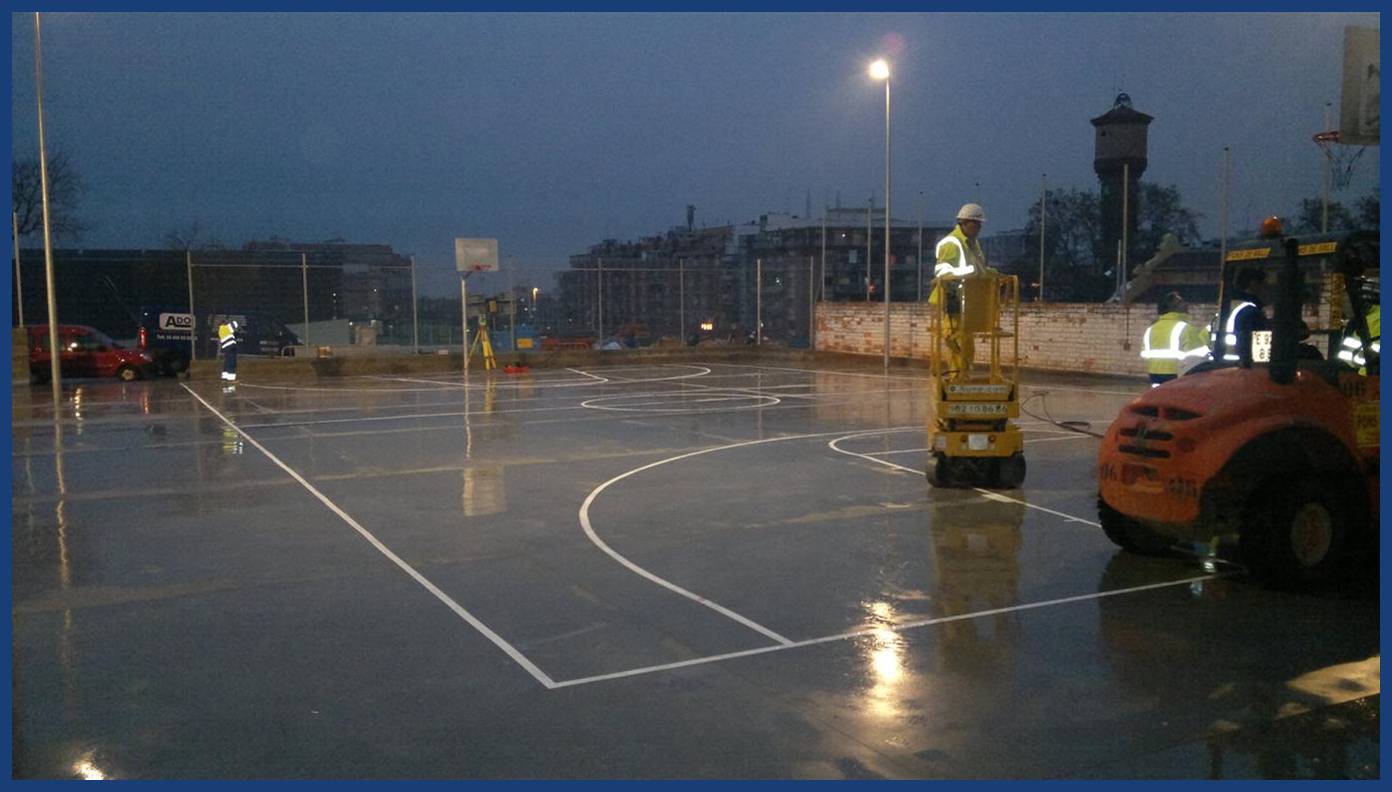 Para realizar la pista de básquet tuvimos que allanar el terreno mediante maquinaria especial y hacer las planchas de hormigón, darle la capa de pintura correspondiente y por ultimo introducir el material deportivo.