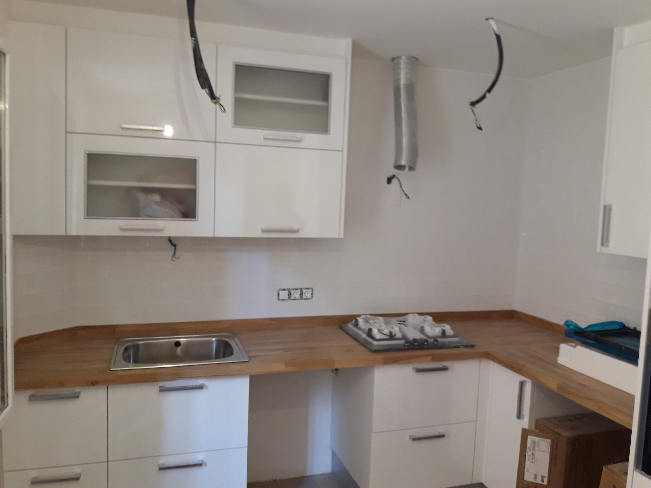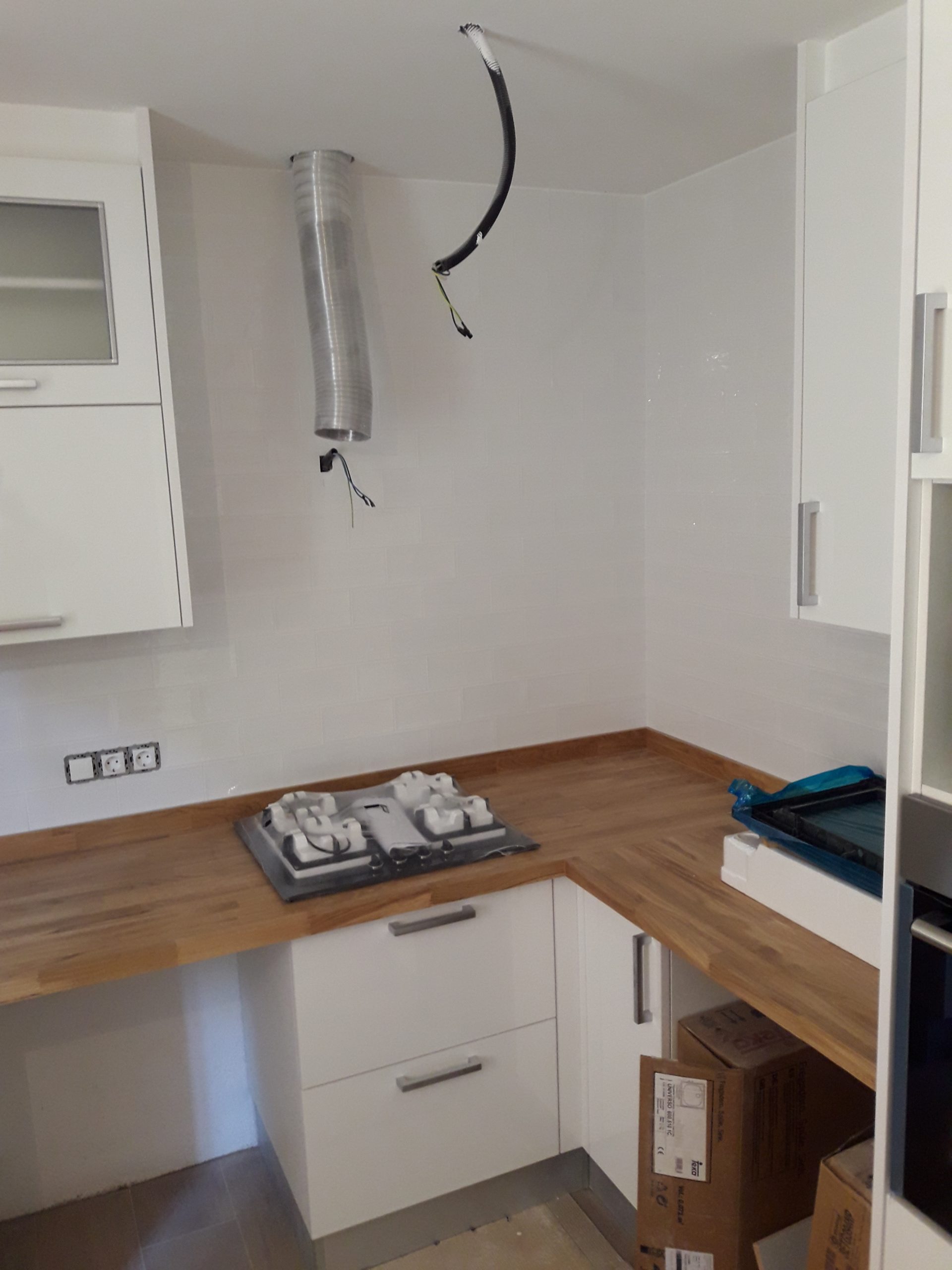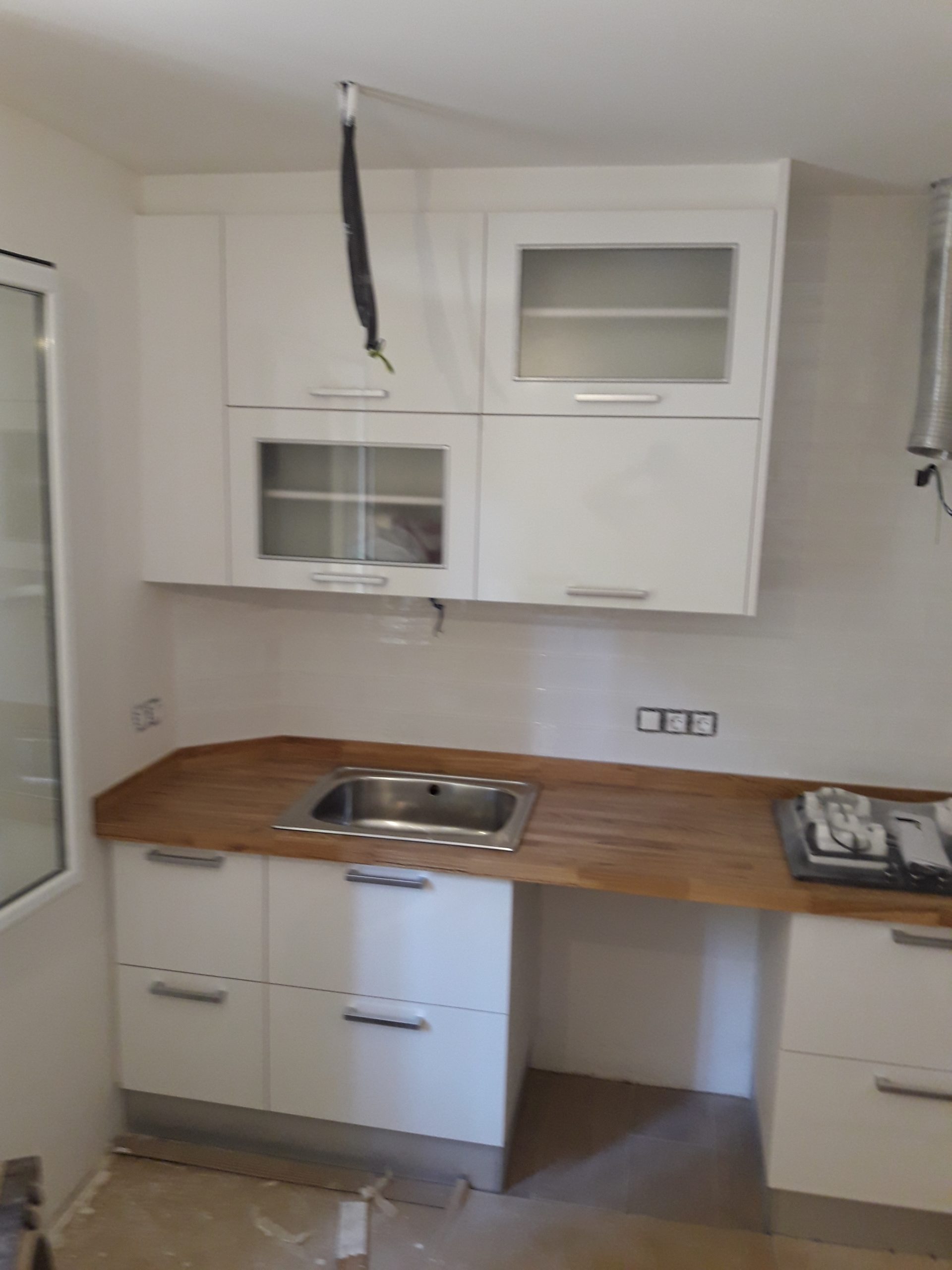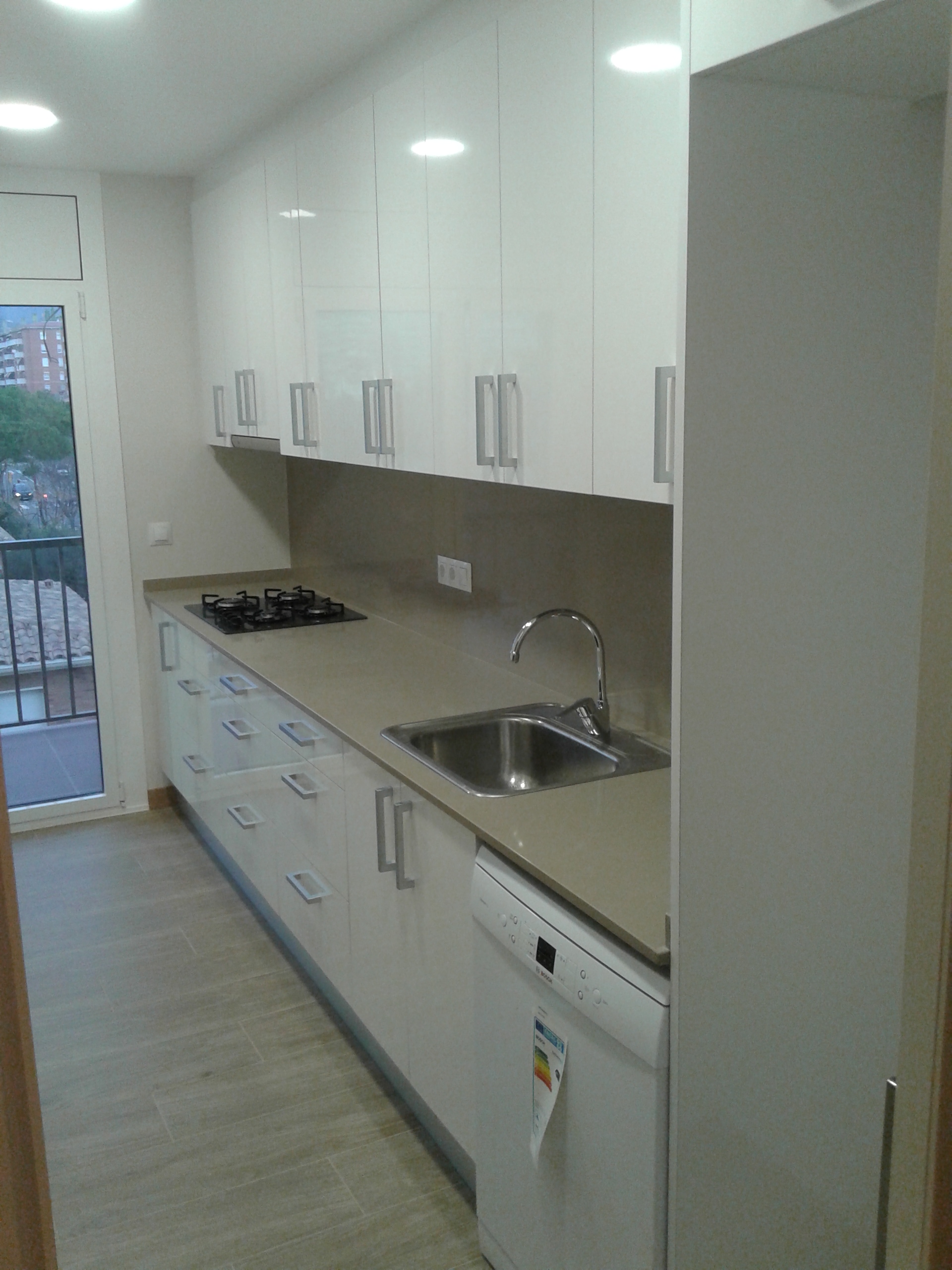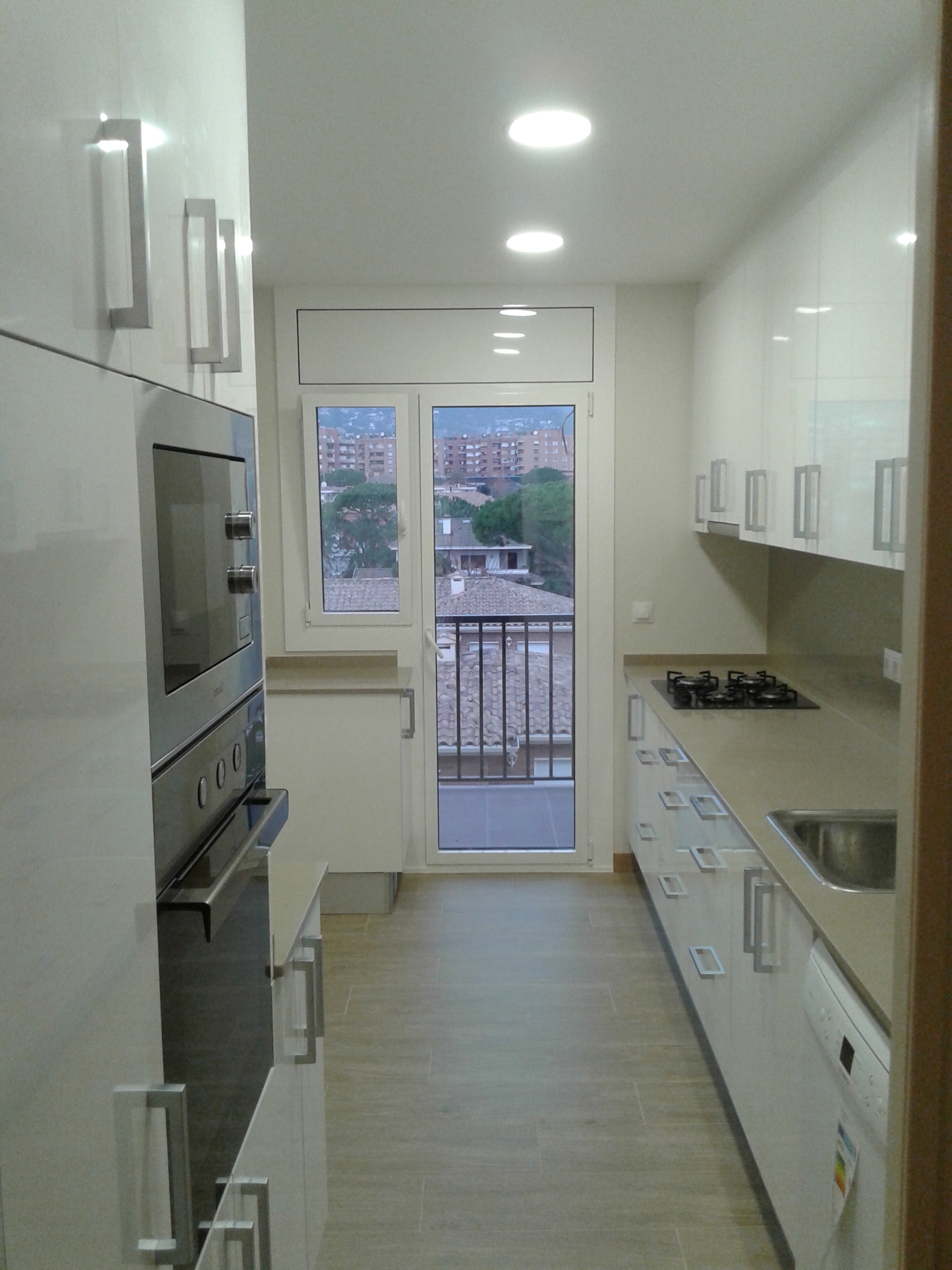 La cocina tuvimos que hacer un cambio completo ya que el cliente quería cambiar de lado lo que es la encimera , para ello tuvimos que hacer todas las instalaciones tanto de agua como eléctricas nuevas en la pared paralela, i se hicieron los revestimientos con las baldosas a gusto del cliente, también se le hizo todo un mueble de cocina a media, con unos de armarios altos a conjunto y un acabado de silestone para la encimera, en la pared frontal también le hicimos un mobiliario a medida que consistían en dos columnas, una a modo de armario y otra donde se instaló el horno y el microondas , y dos pequeños armarios bajos que también tenían acabado en silestone para que los pudiera usar como mueble auxiliar.