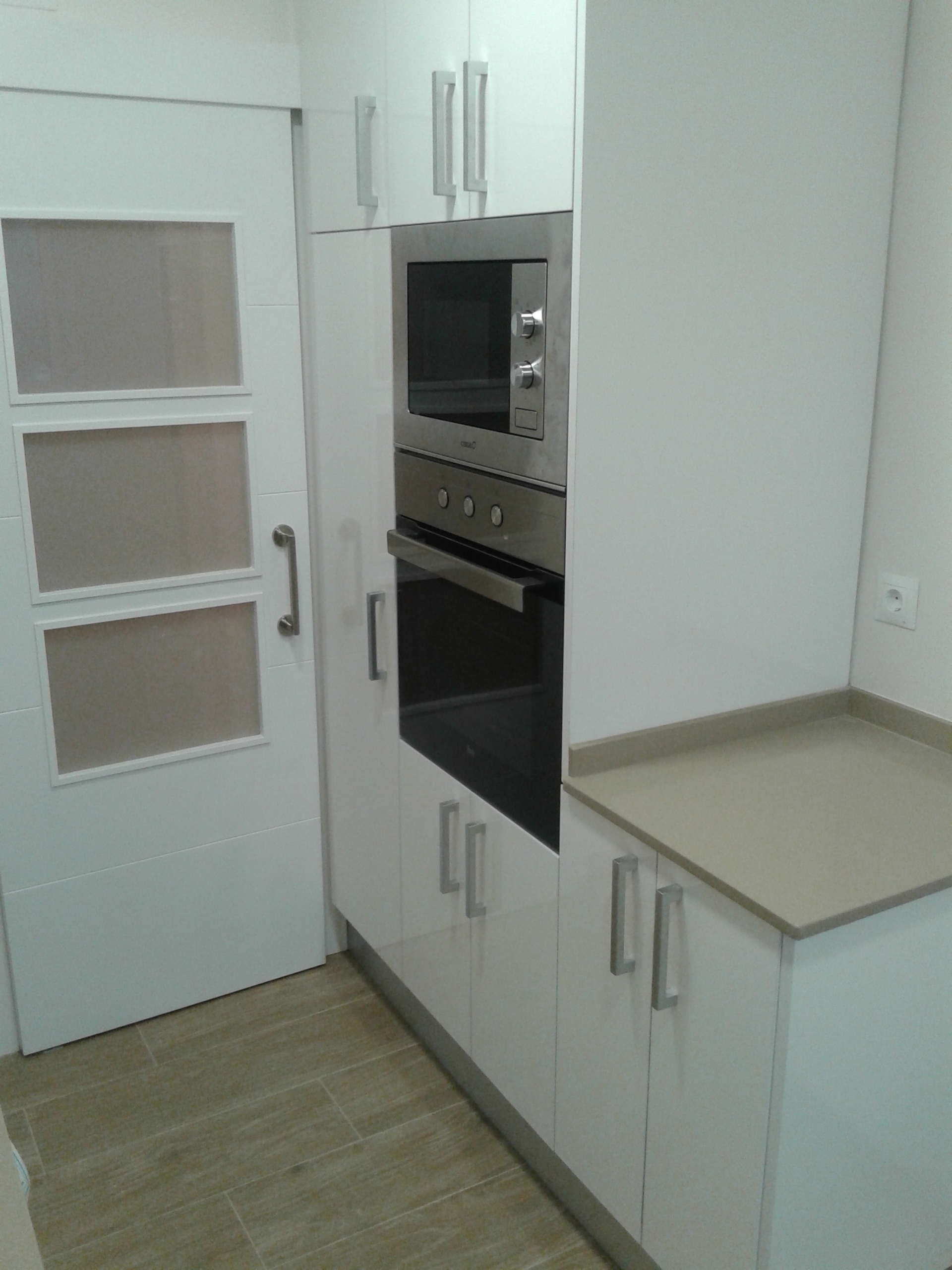 En la cocina se le realizo una encimera en forma de “L” con un par de muebles altos y una columna para el horno y el microondas integrado. Todos los acabados y el diseño son elegidos por el cliente.