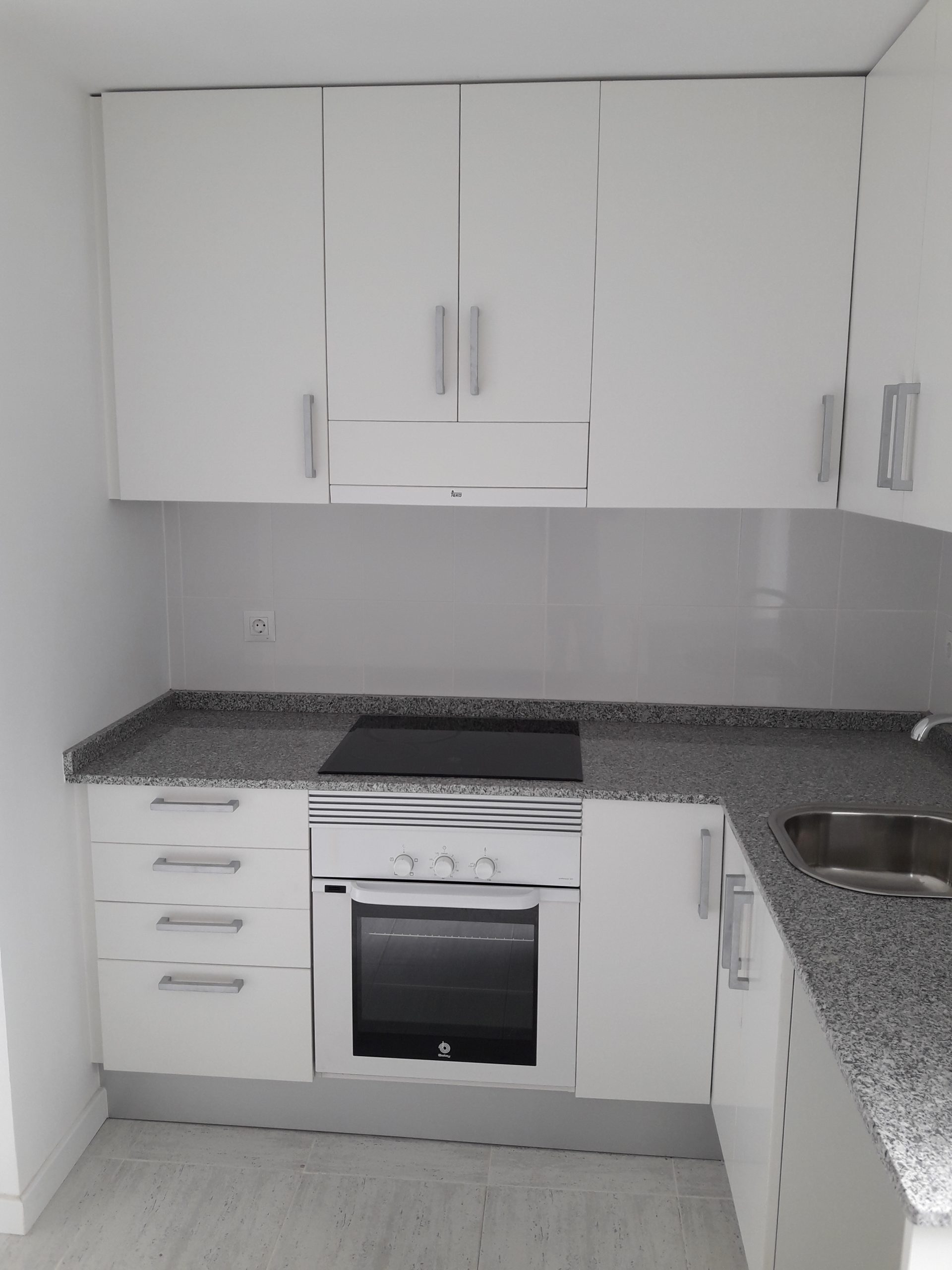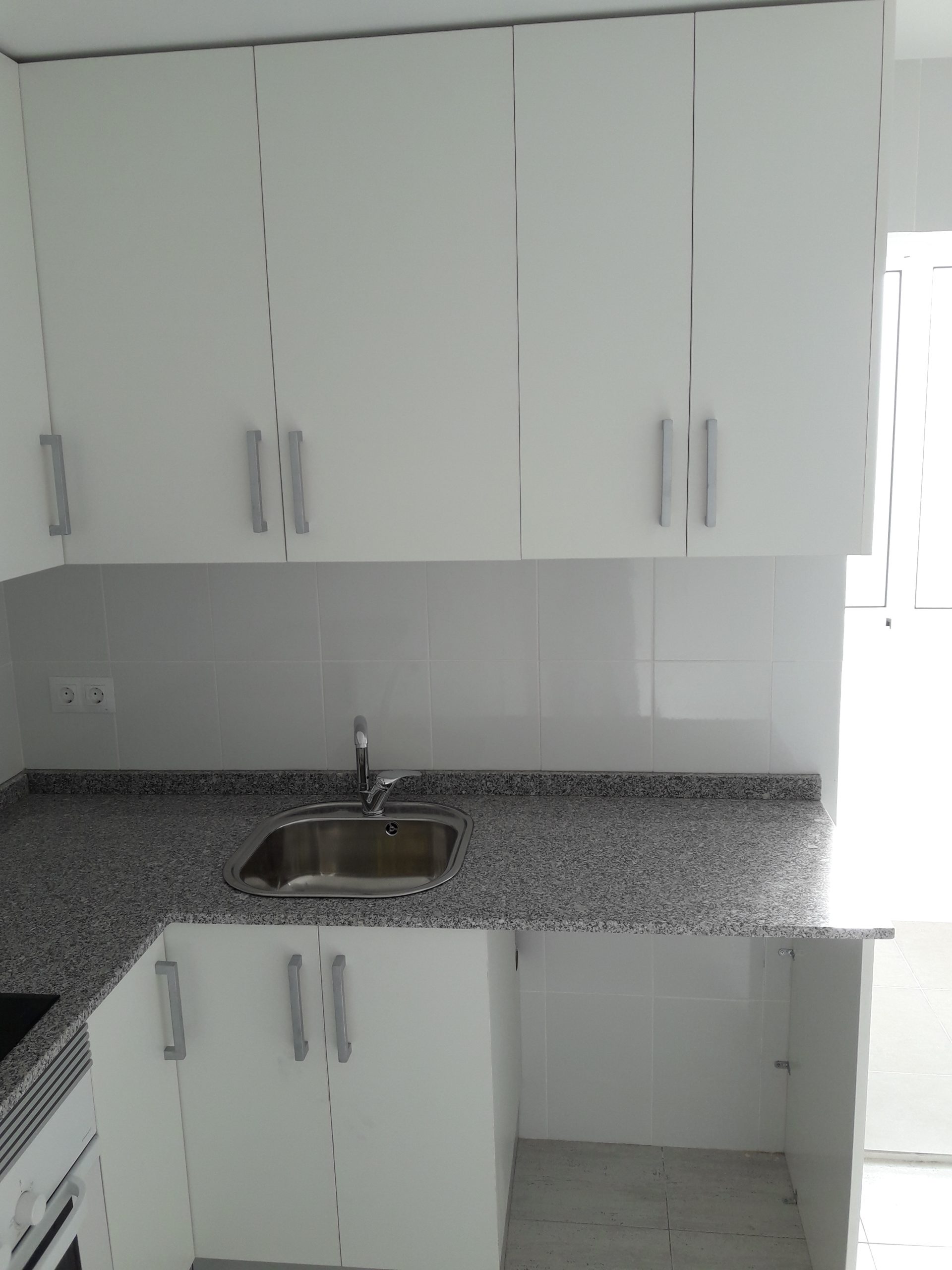 Para la cocina después de cambiar la instalación eléctrica y del agua, se hizo todo el mobiliario a medida a gusto del cliente colocando una encimera en “u” con varios muebles altos, y en una de las paredes se hizo todo un forro con tres columnas, una armario, una hueco para colocar la nevera y una columna de horno y microondas integrado.