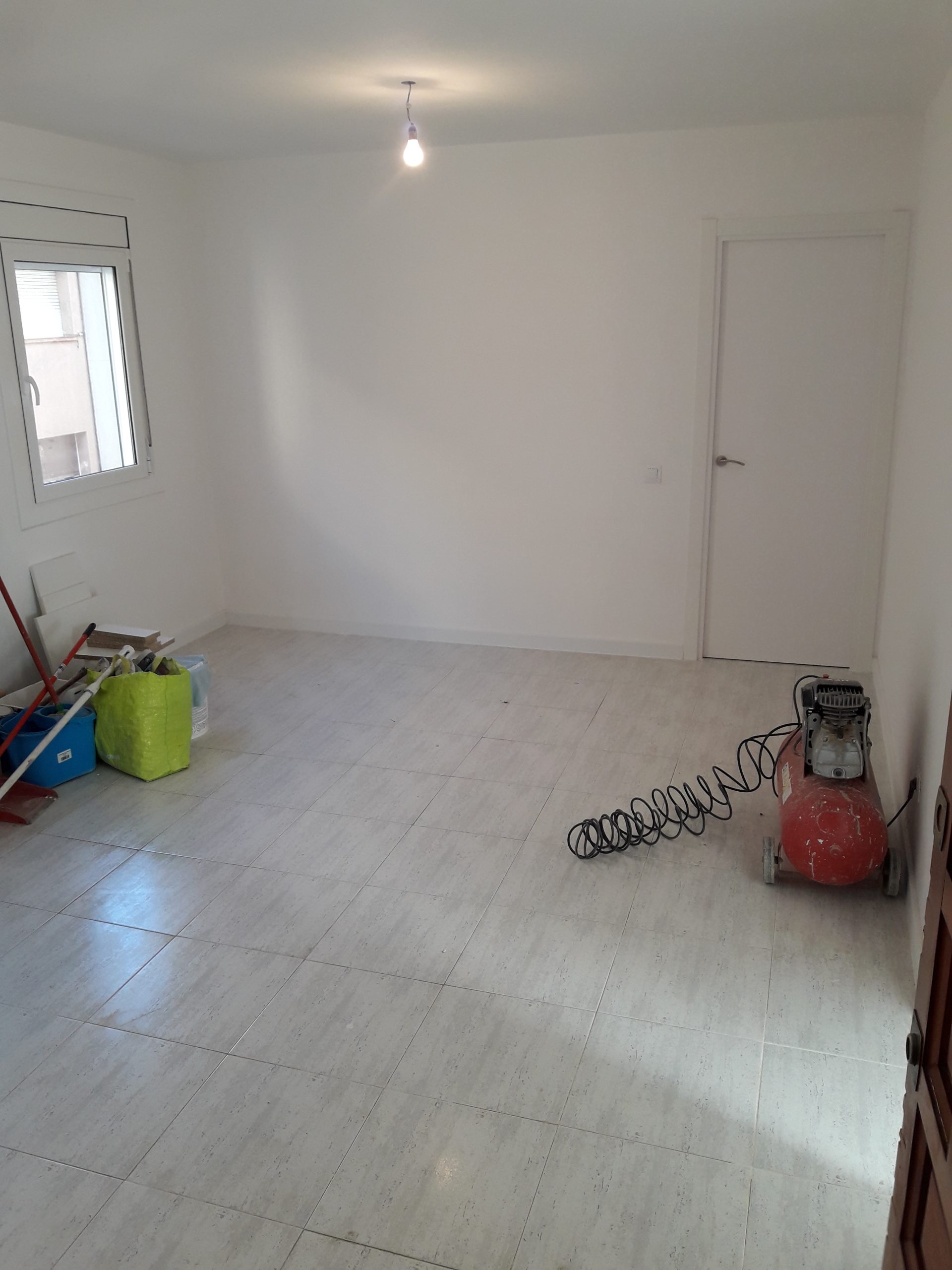 Lo primero que hicimos fue el derribo y el saneado de paredes y techos, luego se cambió toda la instalación eléctrica y de agua, posteriormente se hizo el pintado y la reparación de las paredes, falsos techos, nuevos suelos de parqué en todo el piso menos en baño y cocina que se colocó baldosa. Se cambiaron todas la puertas incluyendo la puerta de entrada que se cambió por una nueva puerta de seguridad. El armario empotrado de la habitación está hecho a medida.